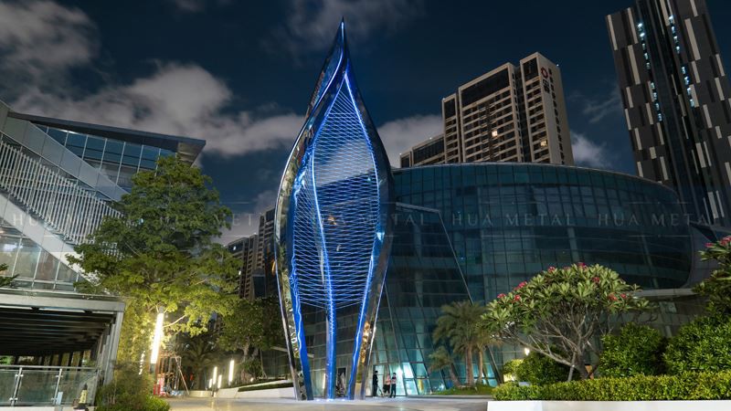 Nicméně, ten, který bychom rádi představili, je zrcadlově leštěná zahradní socha z nerezové oceli, která se nachází v Xiamen v Číně. Je navržen domácím umělcem a vyroben z nerezové oceli 316L, s výškou stojanu 28 metrů. Vnitřní konstrukce je z uhlíkové oceli Q345B s konzervační úpravou.